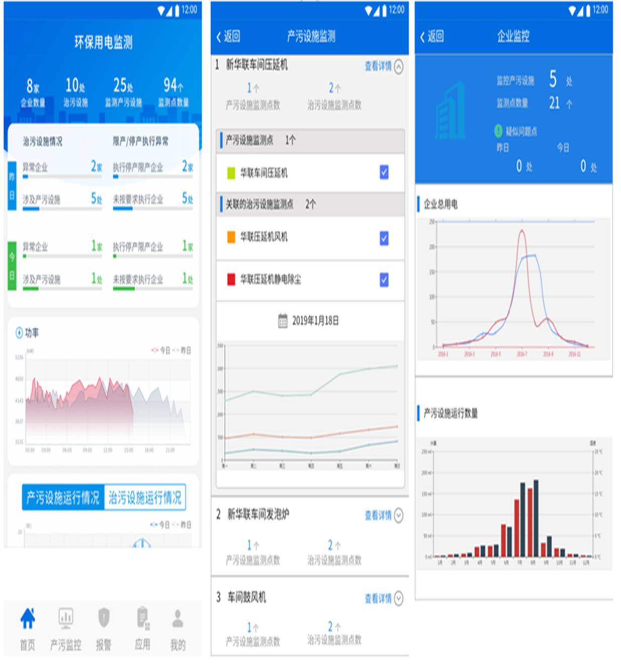 平臺首頁顯示企業(yè)概況,用電統(tǒng)計,產(chǎn)污設(shè)施運行柱狀圖,治污設(shè)施運行柱狀圖,如圖所示: