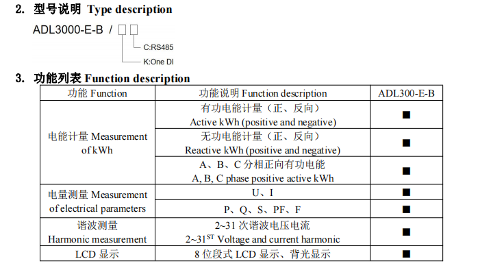 ADL3000-E 系列 UL認證電能表,根據(jù)GB/T 《靜止式有功電能表》標(biāo)準(zhǔn)結(jié)合電力行業(yè)內(nèi)不同通訊規(guī)約要求等設(shè)計制造。三相四線互感式電能表(導(dǎo)軌)集計量,顯示,通訊,控制功能干一身,適用干三相四線中直接接入或一次接入,具有正反向有功電能,無功電能計量功能,能測量各相電壓、電流、功率:功率因數(shù)及三相總有功功率,總功率因數(shù)和頻率等參數(shù),也可配罟內(nèi)部時鐘功能,完成分時復(fù)費率的計量功能,儀表且備RS485的通訊功能,直有MODBUS-RTU或者645-97/07的通訊功能??蓾M足各種不同場合的組網(wǎng)要求??蓱?yīng)用于各種電力監(jiān)控系統(tǒng),能耗管理和電能計費系統(tǒng)中,特別適合各商業(yè)廣場、寫字樓、園區(qū)、工廠、學(xué)校、公寓樓宇、充電樁、等場所的總電能計量和總用電管理。