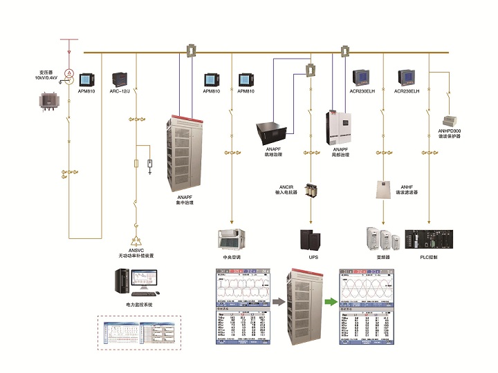 ANAPF系列有源電力濾波器并聯(lián)在含諧波負載的低壓配電系統(tǒng)中,能夠?qū)討B(tài)變化的諧波電流進行快速實時的跟蹤和補償。